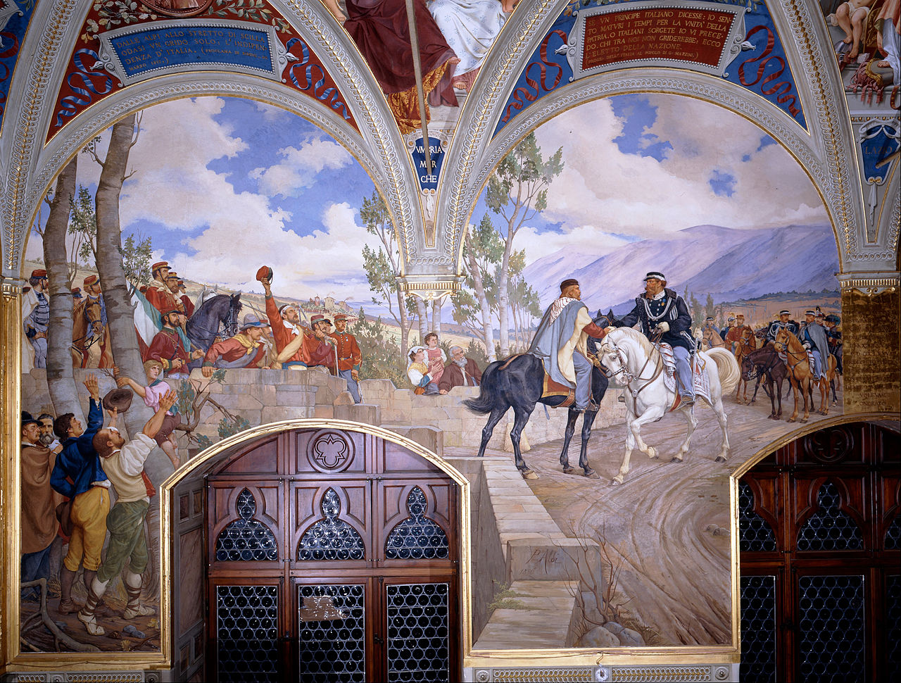Vennero chiamati i più importanti artisti del momento come Simone Martini ed Ambrogio Lorenzetti. Simone Martini (Siena, 1284 – Avignone, luglio 1344) dipinse la Maestà dal 1311 al 1315, dipinta secondo i canoni estetici allora di moda e affidando alle scritte il suo messaggio. Di fronte alla Maestà cavalca fiero Guidoriccio da Fogliano, affresco (1330) attribuito con controversie a Simone Martini. Ambrogio Lorenzetti (Siena 1290-1348) è l’altro artista a cui il Governo assegnò il compito di rappresentare il legame tra